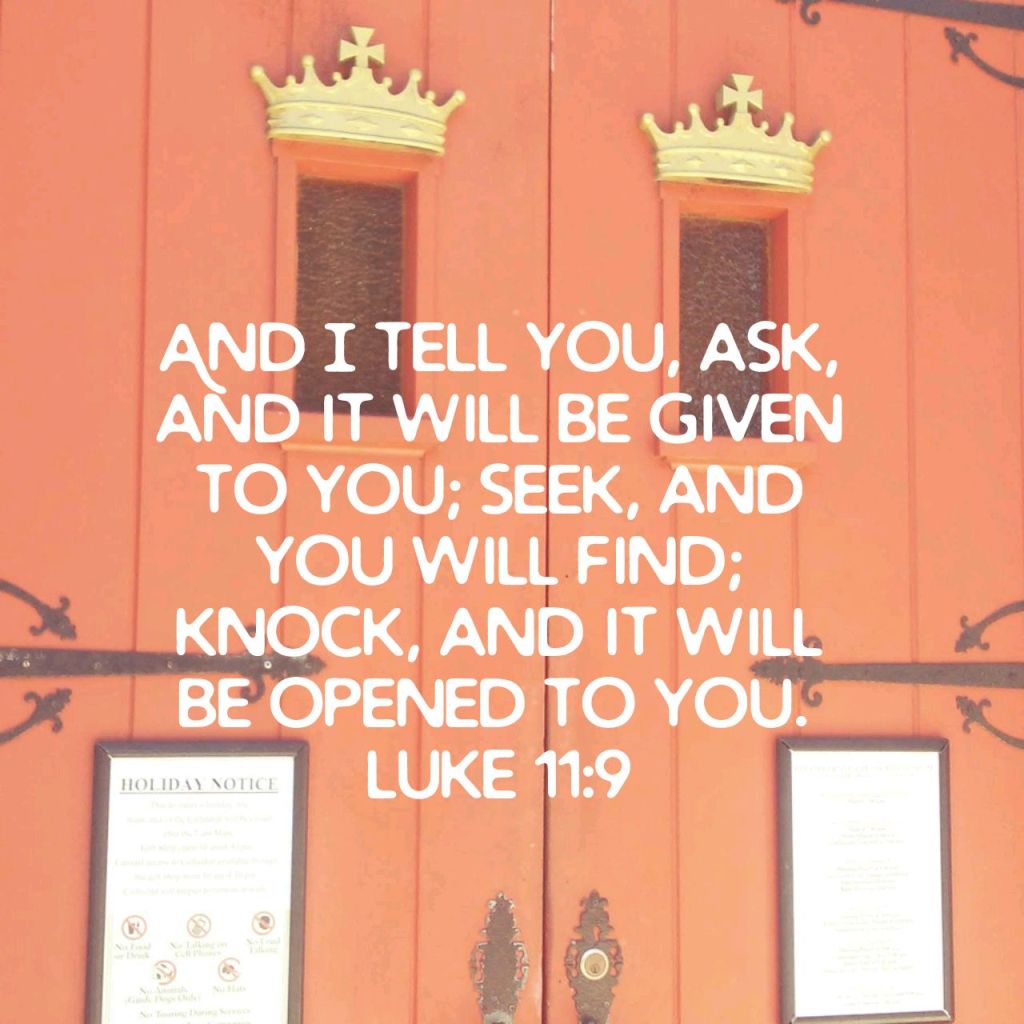 It is interesting that while we use this promise for all kinds of requests, Jesus’ focus is on our asking for and receiving the Holy Spirit. So, let’s look again at this verse. First, “Ask and you will receive.” Here is a promise for a greater fullness that comes when we ask, not for material things, success or even healing, but for God Himself. Second, comes a time seeking. God allows us to pass through a space between asking and receiving, to test whether we will continue. Mary and Joseph had to travel 90 miles on foot to Bethlehem. The wise men came from over a thousand miles, but Jesus came all the way from Heaven to earth to seek for us. We have only to journey to the cross to find Him waiting there for us. Last of all comes knocking. When we have come as far as we know, and yet there appears to be a closed door at the end of the road, Jesus tells us not to turn away or sit outside in despair. The door is closed, but not locked and our Heavenly Father waits inside, eagerly listening for our knock. Do we desire Him more than anything else, or will we turn aside for something more easily obtained? Do not be afraid to bruise your knuckles on the door! God has promised bread and not a stone to hungry children, and an egg and not a scorpion for those who thirst for the living water of His Holy Spirit and all the fullness of Christ when He opens His door for us!