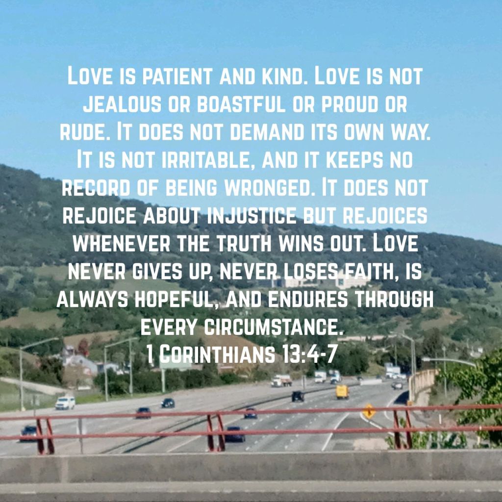 Love is patient and kind; love does not envy or boast; it is not arrogant or rude. It does not insist on its own way; it is not irritable or resentful it does not rejoice at wrongdoing but rejoices with the truth.Love bears all things, believes all things, hopes all things, endures all things.1 Corinthians 13:4-7