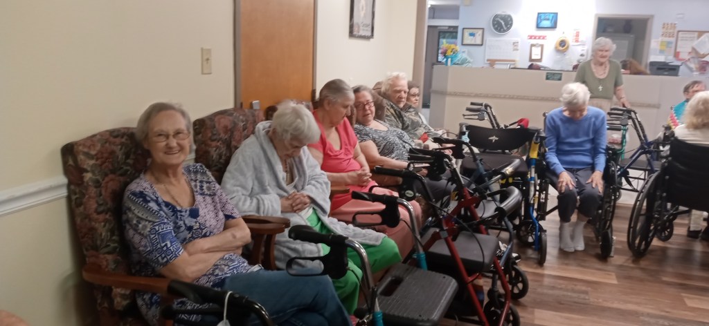 I was so excited that the ladies’ group from our church volunteered to make Easter cards for the nursing homes I visit, but my expectations were low as to how many they might put together. How surprised I was this week when I was handed a pack of over 100 cards along with a request to come and help pass them out! This morning was the first event, and we went into the memory care wing of Sunshine Christian home. Though the people love me and look forward to the music each week, they just lit up with joy to see the ladies singing along with the Easter hymns this morning.