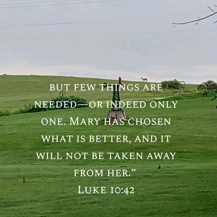 But the Lord answered her, “Martha, Martha, you are anxious and troubled about many things, but one thing is necessary. Mary has chosen the good portion, which will not be taken away from her.” Luke 10:41-42 ESV